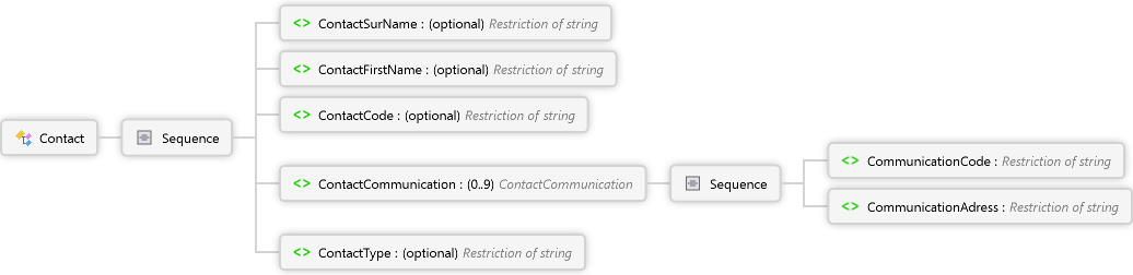 ContactType Element CommunicationAdress Element CommunicationCode Element Sequence ContactCommunication Element ContactCode Element ContactFirstName Element ContactSurName Element Sequence Contact Complex Type