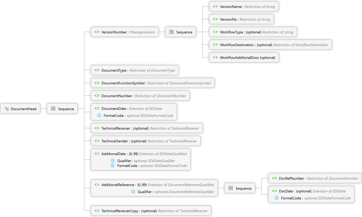 TechnicalReceiverCopy Element DocDate Element DocRefNumber Element Sequence AdditionalReference Element AdditionalDate Element TechnicalSender Element TechnicalReceiver Element DocumentDate Element DocumentNumber Element DocumentFunctionSymbol Element DocumentType Element WorkflowAdditonalDocs Element WorkflowDestination Element WorkflowType Element VersionNo Element VersionName Element Sequence VersionNumber Element Sequence DocumentHead Complex Type