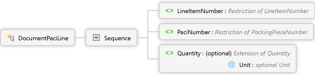 <xs:complexTypename="DocumentPaciLine"xmlns:xs="http://www.w3.org/2001/XMLSchema"><xs:annotation><xs:documentationxml:lang="de"> Verknüpfung zwischen den Struktrem LINE und PACI (n:m) </xs:documentation><xs:documentationxml:lang="en"> Link between LINE and PACI (n..m)</xs:documentation></xs:annotation><xs:sequence><xs:elementname="LineItemNumber"type="LineItemNumber"minOccurs="1"><xs:annotation><xs:documentationxml:lang="de"> Referenz auf eine Positionsnummer aus LINE</xs:documentation><xs:documentationxml:lang="en"> reference to a position defined in LINE</xs:documentation></xs:annotation></xs:element><xs:elementname="PaciNumber"type="PackingPieceNumber"minOccurs="1"><xs:annotation><xs:documentationxml:lang="de"> Referenz auf eine in PACI definierte Packstückposition</xs:documentation><xs:documentationxml:lang="en"> Reference to a position defined in PACi</xs:documentation></xs:annotation></xs:element><xs:elementname="Quantity"type="Quantity"minOccurs="0"><xs:annotation><xs:documentationxml:lang="de"> Anzahl der Einheiten von LINE in PACI</xs:documentation><xs:documentationxml:lang="en"> Number of units from LINE in PACI</xs:documentation></xs:annotation></xs:element></xs:sequence></xs:complexType>