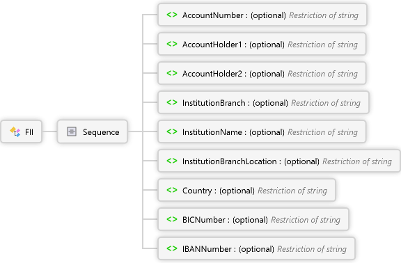 <xs:complexTypename="FII"xmlns:xs="http://www.w3.org/2001/XMLSchema"><xs:annotation><xs:documentationxml:lang="de">Block für Finanzinformationen</xs:documentation><xs:documentationxml:lang="en">Group for financial information</xs:documentation></xs:annotation><xs:sequence><xs:elementname="AccountNumber"minOccurs="0"><xs:annotation><xs:documentationxml:lang="de">Kontonummer </xs:documentation><xs:documentationxml:lang="en">Account Number </xs:documentation></xs:annotation><xs:simpleType><xs:restrictionbase="xs:string"><xs:maxLengthvalue="35"/></xs:restriction></xs:simpleType></xs:element><xs:elementname="AccountHolder1"minOccurs="0"><xs:annotation><xs:documentationxml:lang="de">Konto Inhaber Zeile 1 </xs:documentation><xs:documentationxml:lang="en">Account holder Line 1</xs:documentation></xs:annotation><xs:simpleType><xs:restrictionbase="xs:string"><xs:maxLengthvalue="35"/></xs:restriction></xs:simpleType></xs:element><xs:elementname="AccountHolder2"minOccurs="0"><xs:annotation><xs:documentationxml:lang="de">Konto Inhaber Zeile 2 </xs:documentation><xs:documentationxml:lang="en">Account holder Line 2</xs:documentation></xs:annotation><xs:simpleType><xs:restrictionbase="xs:string"><xs:maxLengthvalue="35"/></xs:restriction></xs:simpleType></xs:element><xs:elementname="InstitutionBranch"minOccurs="0"><xs:annotation><xs:documentationxml:lang="de">Niederlassung der Bank</xs:documentation><xs:documentationxml:lang="en">Branch of the bank</xs:documentation></xs:annotation><xs:simpleType><xs:restrictionbase="xs:string"><xs:maxLengthvalue="17"/></xs:restriction></xs:simpleType></xs:element><xs:elementname="InstitutionName"minOccurs="0"><xs:annotation><xs:documentationxml:lang="de">Name der Bank </xs:documentation><xs:documentationxml:lang="en">Name of the bank</xs:documentation></xs:annotation><xs:simpleType><xs:restrictionbase="xs:string"><xs:maxLengthvalue="70"/></xs:restriction></xs:simpleType></xs:element><xs:elementname="InstitutionBranchLocation"minOccurs="0"><xs:annotation><xs:documentationxml:lang="de">Ort der Bankfiliale </xs:documentation><xs:documentationxml:lang="en">City of the bank branch</xs:documentation></xs:annotation><xs:simpleType><xs:restrictionbase="xs:string"><xs:maxLengthvalue="70"/></xs:restriction></xs:simpleType></xs:element><xs:elementname="Country"minOccurs="0"><xs:annotation><xs:documentationxml:lang="de">Land der Bank </xs:documentation><xs:documentationxml:lang="en">City of the bank</xs:documentation></xs:annotation><xs:simpleType><xs:restrictionbase="xs:string"><xs:maxLengthvalue="2"/></xs:restriction></xs:simpleType></xs:element><xs:elementname="BICNumber"minOccurs="0"><xs:annotation><xs:documentationxml:lang="de">BIC Code </xs:documentation><xs:documentationxml:lang="en">BIC Code</xs:documentation></xs:annotation><xs:simpleType><xs:restrictionbase="xs:string"><xs:maxLengthvalue="17"/></xs:restriction></xs:simpleType></xs:element><xs:elementname="IBANNumber"minOccurs="0"><xs:annotation><xs:documentationxml:lang="de">IBAN</xs:documentation><xs:documentationxml:lang="en">IBAN</xs:documentation></xs:annotation><xs:simpleType><xs:restrictionbase="xs:string"><xs:maxLengthvalue="35"/></xs:restriction></xs:simpleType></xs:element></xs:sequence></xs:complexType>