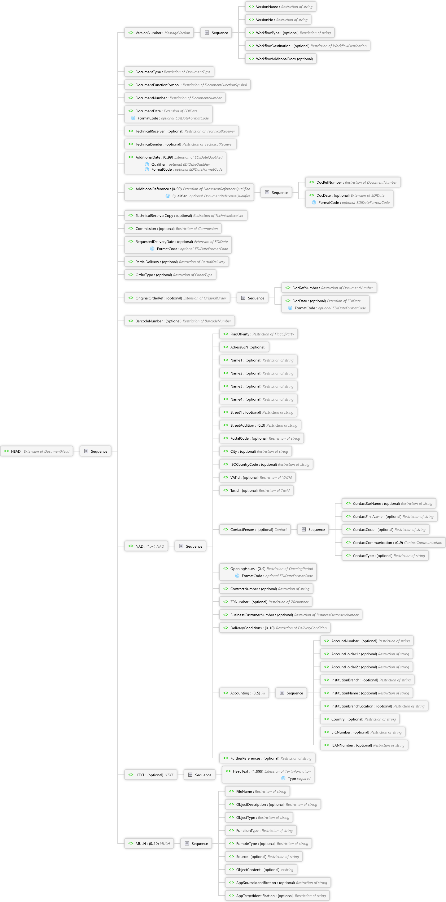 AppTargetIdentification Element AppSourceIdentification Element ObjectContent Element Source Element RemoteType Element FunctionType Element ObjectType Element ObjectDescription Element FileName Element Sequence MULH Element HeadText Element Sequence HTXT Element FurtherReferences Element IBANNumber Element BICNumber Element Country Element InstitutionBranchLocation Element InstitutionName Element InstitutionBranch Element AccountHolder2 Element AccountHolder1 Element AccountNumber Element Sequence Accounting Element DeliveryConditions Element BusinessCustomerNumber Element ZRNumber Element ContractNumber Element OpeningHours Element ContactType Element ContactCommunication Element ContactCode Element ContactFirstName Element ContactSurName Element Sequence ContactPerson Element TaxId Element VATId Element ISOCountryCode Element City Element PostalCode Element StreetAddition Element Street1 Element Name4 Element Name3 Element Name2 Element Name1 Element AdressGLN Element FlagOfParty Element Sequence NAD Element BarcodeNumber Element DocDate Element DocRefNumber Element Sequence OriginalOrderRef Element OrderType Element PartialDelivery Element RequestedDeliveryDate Element Commission Element TechnicalReceiverCopy Element DocDate Element DocRefNumber Element Sequence AdditionalReference Element AdditionalDate Element TechnicalSender Element TechnicalReceiver Element DocumentDate Element DocumentNumber Element DocumentFunctionSymbol Element DocumentType Element WorkflowAdditonalDocs Element WorkflowDestination Element WorkflowType Element VersionNo Element VersionName Element Sequence VersionNumber Element Sequence HEAD Element