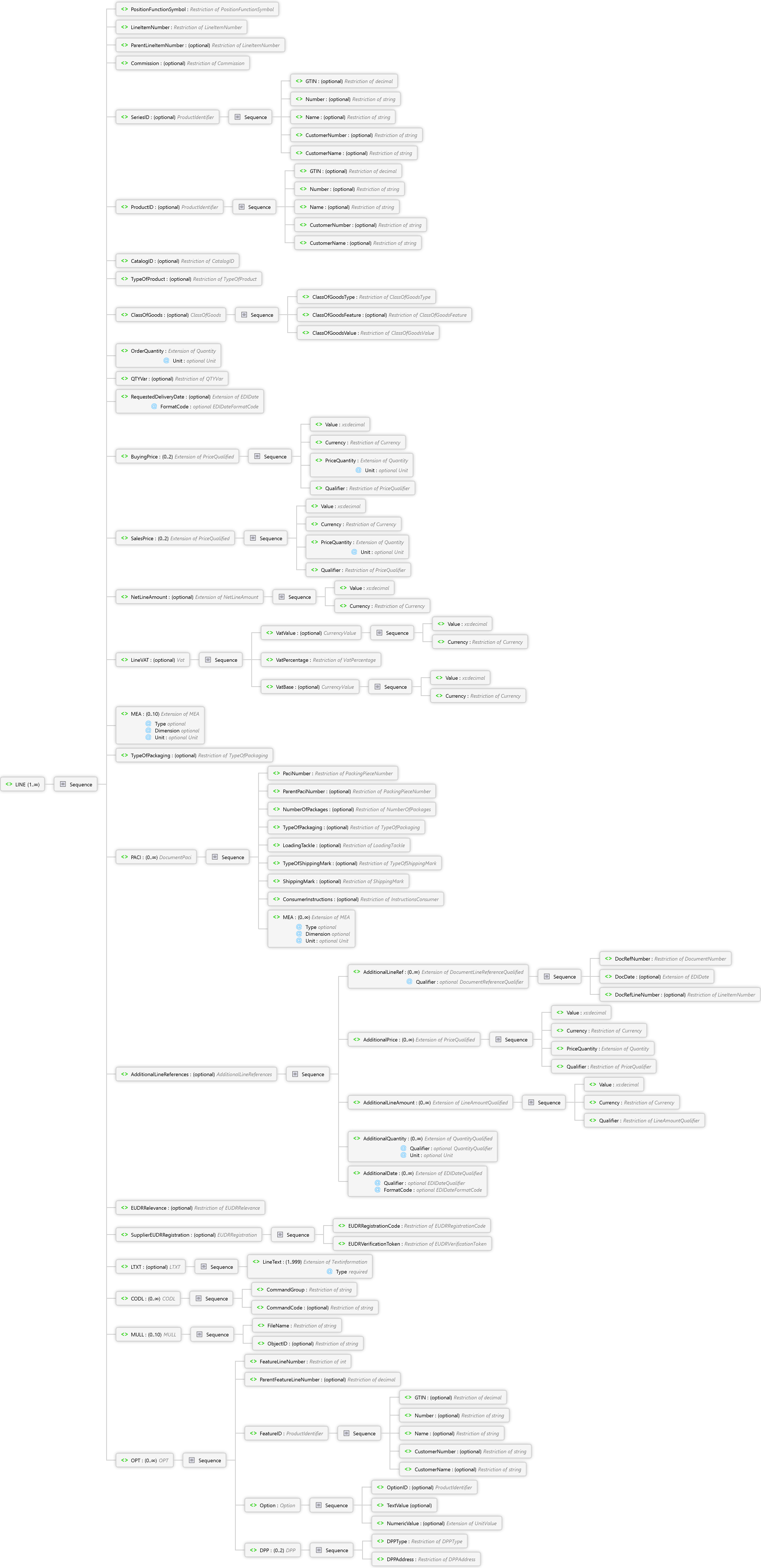 <xs:elementname="LINE"minOccurs="1"maxOccurs="unbounded"xmlns:xs="http://www.w3.org/2001/XMLSchema"><xs:annotation><xs:documentationxml:lang="de">Positionen der Bestelländerung (ORDCHG) </xs:documentation><xs:documentationxml:lang="en">Positions of the order change(ORDCHG) </xs:documentation></xs:annotation><xs:complexType><xs:sequence><xs:elementname="PositionFunctionSymbol"type="PositionFunctionSymbol"minOccurs="1"/><xs:elementname="LineItemNumber"type="LineItemNumber"minOccurs="1"/><xs:elementname="ParentLineItemNumber"type="LineItemNumber"minOccurs="0"/><xs:elementname="Commission"type="Commission"minOccurs="0"/><xs:elementname="SeriesID"type="ProductIdentifier"minOccurs="0"/><xs:elementname="ProductID"type="ProductIdentifier"minOccurs="0"/><xs:elementname="CatalogID"type="CatalogID"minOccurs="0"/><xs:elementname="TypeOfProduct"type="TypeOfProduct"minOccurs="0"/><xs:elementname="ClassOfGoods"type="ClassOfGoods"minOccurs="0"/><xs:elementname="OrderQuantity"type="Quantity"/><xs:elementname="QTYVar"type="QTYVar"minOccurs="0"/><xs:elementname="RequestedDeliveryDate"type="EDIDate"minOccurs="0"/><xs:elementname="BuyingPrice"type="PriceQualified"minOccurs="0"maxOccurs="2"/><xs:elementname="SalesPrice"type="PriceQualified"minOccurs="0"maxOccurs="2"/><!-- <xs:element name="GrossLineAmount" type="GrossLineAmount" minOccurs="0" /> --><xs:elementname="NetLineAmount"type="NetLineAmount"minOccurs="0"/><xs:elementname="LineVAT"type="Vat"minOccurs="0"/><xs:elementname="MEA"type="MEA"minOccurs="0"maxOccurs="10"/><xs:elementname="TypeOfPackaging"type="TypeOfPackaging"minOccurs="0"/><xs:elementname="PACI"type="DocumentPaci"minOccurs="0"maxOccurs="unbounded"/><xs:elementname="AdditionalLineReferences"type="AdditionalLineReferences"minOccurs="0"maxOccurs="1"/><xs:elementname="EUDRRelevance"type="EUDRRelevance"minOccurs="0"maxOccurs="1"/><xs:elementname="SupplierEUDRRegistration"type="EUDRRegistration"minOccurs="0"maxOccurs="1"/><xs:elementname="LTXT"type="LTXT"minOccurs="0"maxOccurs="1"/><xs:elementname="CODL"type="CODL"minOccurs="0"maxOccurs="unbounded"/><xs:elementname="MULL"type="MULL"minOccurs="0"maxOccurs="10"/><xs:elementname="OPT"type="OPT"minOccurs="0"maxOccurs="unbounded"/></xs:sequence></xs:complexType></xs:element>