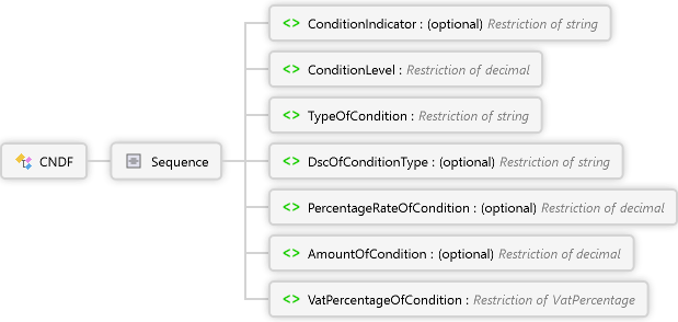 <xs:complexTypename="CNDF"xmlns:xs="http://www.w3.org/2001/XMLSchema"><xs:annotation><xs:documentationxml:lang="de">Segment für Konditionen zu einem Beleg </xs:documentation><xs:documentationxml:lang="en">Segment for conditions for the complete document </xs:documentation></xs:annotation><xs:sequence><xs:elementname="ConditionIndicator"minOccurs="0"><xs:annotation><xs:documentationxml:lang="de"><dl><dt>Konditionskennzeichen</dt><dt>A = Abschlag</dt><dt>C = ZUschlag</dt></dl></xs:documentation><xs:documentationxml:lang="en"><dl><dt>Condition Indicator</dt><dt>A = Allowence</dt><dt>C = Charge</dt></dl></xs:documentation></xs:annotation><xs:simpleType><xs:restrictionbase="xs:string"><xs:maxLengthvalue="3"/></xs:restriction></xs:simpleType></xs:element><xs:elementname="ConditionLevel"><xs:annotation><xs:documentationxml:lang="de"><dl><dt>Konditionsstufe</dt><dt>Reihenfolge in der die Konditionen angewendet werden</dt><dt>1 = Anwendung auf den Basisbetrag</dt><dt>2 = Awendung auf den durch 1 veränderten Basisbetrag</dt><dt>3 = Awendung auf den durch 2 veränderten Betrag</dt><dt>etc.</dt></dl></xs:documentation><xs:documentationxml:lang="de"><dl><dt>Condition levele</dt><dt>Sequence of calculation</dt></dl></xs:documentation></xs:annotation><xs:simpleType><xs:restrictionbase="xs:decimal"><xs:totalDigitsvalue="3"/></xs:restriction></xs:simpleType></xs:element><xs:elementname="TypeOfCondition"><xs:annotation><xs:documentationxml:lang="de"><dl><dt>Konditionsart</dt><dt>DI = Rabattt</dt><dt>FC = Frachtkosten</dt><dt>IN = Versicherung</dt><dt>PC = Verpacken, Handlingskosten</dt></dl></xs:documentation><xs:documentationxml:lang="en"><dl><dt>Type of conditiont</dt><dt>DI = Rebate</dt><dt>FC = Freight Cost</dt><dt>IN = Insurance</dt><dt>PC = Handling costs</dt></dl></xs:documentation></xs:annotation><xs:simpleType><xs:restrictionbase="xs:string"><xs:maxLengthvalue="3"/></xs:restriction></xs:simpleType></xs:element><xs:elementname="DscOfConditionType"minOccurs="0"><xs:annotation><xs:documentationxml:lang="de">Textliche Beschreibun der Kondition </xs:documentation><xs:documentationxml:lang="en">Description of the condition </xs:documentation></xs:annotation><xs:simpleType><xs:restrictionbase="xs:string"><xs:maxLengthvalue="35"/></xs:restriction></xs:simpleType></xs:element><xs:elementname="PercentageRateOfCondition"minOccurs="0"><xs:annotation><xs:documentationxml:lang="de">Prozentsatz der Kondition </xs:documentation><xs:documentationxml:lang="en">Percentage value of the condition </xs:documentation></xs:annotation><xs:simpleType><xs:restrictionbase="xs:decimal"><xs:totalDigitsvalue="10"/></xs:restriction></xs:simpleType></xs:element><xs:elementname="AmountOfCondition"minOccurs="0"><xs:annotation><xs:documentationxml:lang="de">Betrag der Kondition </xs:documentation><xs:documentationxml:lang="en">Amount value of the condition </xs:documentation></xs:annotation><xs:simpleType><xs:restrictionbase="xs:decimal"><xs:totalDigitsvalue="15"/></xs:restriction></xs:simpleType></xs:element><xs:elementname="VatPercentageOfCondition"type="VatPercentage"minOccurs="1"><xs:annotation><xs:documentationxml:lang="de">Steuersatz der Kondition </xs:documentation><xs:documentationxml:lang="en">Vat of the condition </xs:documentation></xs:annotation></xs:element></xs:sequence></xs:complexType>