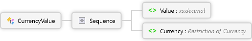 <xs:complexTypename="CurrencyValue"xmlns:xs="http://www.w3.org/2001/XMLSchema"><xs:annotation><xs:documentationxml:lang="de">Betrag, festgelegt über Dezimalwert und Währung</xs:documentation><xs:documentationxml:lang="en">Amount defined by decimal value and currency</xs:documentation></xs:annotation><xs:sequence><xs:elementname="Value"type="xs:decimal"minOccurs="1"maxOccurs="1"/><xs:elementname="Currency"type="Currency"minOccurs="1"maxOccurs="1"/></xs:sequence></xs:complexType>