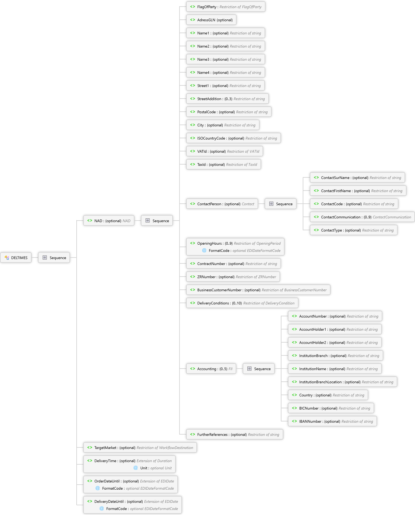 DeliveryDateUntil Element OrderDateUntil Element DeliveryTime Element TargetMarket Element FurtherReferences Element IBANNumber Element BICNumber Element Country Element InstitutionBranchLocation Element InstitutionName Element InstitutionBranch Element AccountHolder2 Element AccountHolder1 Element AccountNumber Element Sequence Accounting Element DeliveryConditions Element BusinessCustomerNumber Element ZRNumber Element ContractNumber Element OpeningHours Element ContactType Element ContactCommunication Element ContactCode Element ContactFirstName Element ContactSurName Element Sequence ContactPerson Element TaxId Element VATId Element ISOCountryCode Element City Element PostalCode Element StreetAddition Element Street1 Element Name4 Element Name3 Element Name2 Element Name1 Element AdressGLN Element FlagOfParty Element Sequence NAD Element Sequence DELTIMES Complex Type