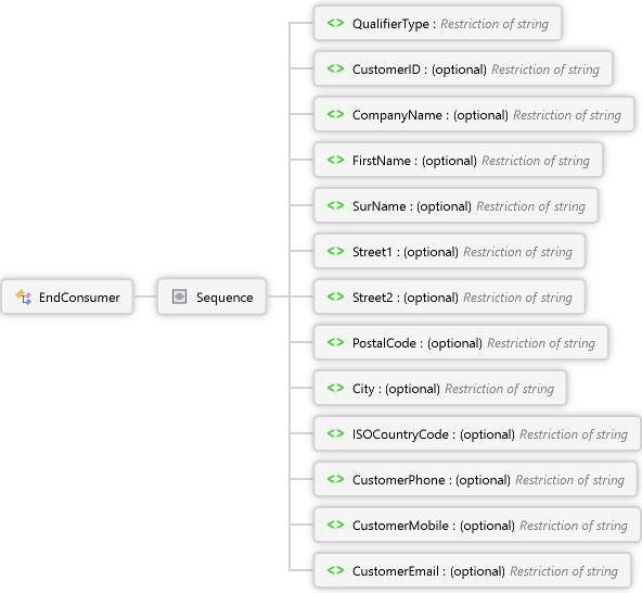 <xs:complexTypename="EndConsumer"xmlns:xs="http://www.w3.org/2001/XMLSchema"><xs:annotation><xs:documentationxml:lang="de">Information zum Endkunden</xs:documentation><xs:documentationxml:lang="en">Information about the end-consumer</xs:documentation></xs:annotation><xs:sequence><xs:elementname="QualifierType"><xs:annotation><xs:documentationxml:lang="de"><dl><dt>Adressart des Endkunden</dt><dt>Codeliste: </dt><dt>UD = Rechnungsadresse</dt><dt>UC = Lieferadresse</dt></dl></xs:documentation><xs:documentationxml:lang="en"><dl><dt>Type of address for the endconsumer </dt><dt>Code list: </dt><dt>UD = Invoice address</dt><dt>UC = Delivery address</dt></dl></xs:documentation></xs:annotation><xs:simpleType><xs:restrictionbase="xs:string"><xs:maxLengthvalue="3"/><!-- <xs:enumeration value="UD"> </xs:enumeration> --><!-- <xs:enumeration value="UC"> </xs:enumeration> --></xs:restriction></xs:simpleType></xs:element><xs:elementname="CustomerID"minOccurs="0"><xs:annotation><xs:documentationxml:lang="de">Kundennummer des Endkunden</xs:documentation><xs:documentationxml:lang="en">Customer ID of the end-consumer</xs:documentation></xs:annotation><xs:simpleType><xs:restrictionbase="xs:string"><xs:maxLengthvalue="35"/></xs:restriction></xs:simpleType></xs:element><xs:elementname="CompanyName"minOccurs="0"><xs:annotation><xs:documentationxml:lang="de">Firmenname des Endkunden</xs:documentation><xs:documentationxml:lang="en">Company name of the end-consumer</xs:documentation></xs:annotation><xs:simpleType><xs:restrictionbase="xs:string"><xs:maxLengthvalue="35"/></xs:restriction></xs:simpleType></xs:element><xs:elementname="FirstName"minOccurs="0"><xs:annotation><xs:documentationxml:lang="de">Vorname des Endkunden</xs:documentation><xs:documentationxml:lang="en">First name of the end-consumer</xs:documentation></xs:annotation><xs:simpleType><xs:restrictionbase="xs:string"><xs:maxLengthvalue="35"/></xs:restriction></xs:simpleType></xs:element><xs:elementname="SurName"minOccurs="0"><xs:annotation><xs:documentationxml:lang="de">Nachname des Endkunden</xs:documentation><xs:documentationxml:lang="en">Surname of the end-consumer</xs:documentation></xs:annotation><xs:simpleType><xs:restrictionbase="xs:string"><xs:maxLengthvalue="35"/></xs:restriction></xs:simpleType></xs:element><xs:elementname="Street1"minOccurs="0"><xs:annotation><xs:documentationxml:lang="de">Strasse Zeile 1</xs:documentation><xs:documentationxml:lang="en">Stree Row 1</xs:documentation></xs:annotation><xs:simpleType><xs:restrictionbase="xs:string"><xs:maxLengthvalue="35"/></xs:restriction></xs:simpleType></xs:element><xs:elementname="Street2"minOccurs="0"><xs:annotation><xs:documentationxml:lang="de">Strasse Zeile 2</xs:documentation><xs:documentationxml:lang="en">Stree Row 2</xs:documentation></xs:annotation><xs:simpleType><xs:restrictionbase="xs:string"><xs:maxLengthvalue="35"/></xs:restriction></xs:simpleType></xs:element><xs:elementname="PostalCode"minOccurs="0"><xs:annotation><xs:documentationxml:lang="de">Postleitzahl</xs:documentation><xs:documentationxml:lang="en">Zip Code</xs:documentation></xs:annotation><xs:simpleType><xs:restrictionbase="xs:string"><xs:maxLengthvalue="9"/></xs:restriction></xs:simpleType></xs:element><xs:elementname="City"minOccurs="0"><xs:annotation><xs:documentationxml:lang="de">Ort</xs:documentation><xs:documentationxml:lang="en">City</xs:documentation></xs:annotation><xs:simpleType><xs:restrictionbase="xs:string"><xs:maxLengthvalue="35"/></xs:restriction></xs:simpleType></xs:element><xs:elementname="ISOCountryCode"minOccurs="0"><xs:annotation><xs:documentationxml:lang="de">ISO Länderkennzeichen</xs:documentation><xs:documentationxml:lang="en">ISO Country Code</xs:documentation></xs:annotation><xs:simpleType><xs:restrictionbase="xs:string"><xs:maxLengthvalue="2"/></xs:restriction></xs:simpleType></xs:element><xs:elementname="CustomerPhone"minOccurs="0"><xs:annotation><xs:documentationxml:lang="de">Telefonnummer des Endkunden</xs:documentation><xs:documentationxml:lang="en">Phone number of the end-consumer</xs:documentation></xs:annotation><xs:simpleType><xs:restrictionbase="xs:string"><xs:maxLengthvalue="70"/></xs:restriction></xs:simpleType></xs:element><xs:elementname="CustomerMobile"minOccurs="0"><xs:annotation><xs:documentationxml:lang="de">Mobilnummer des Endkunden</xs:documentation><xs:documentationxml:lang="en">Mobile phone number of the end-consumer</xs:documentation></xs:annotation><xs:simpleType><xs:restrictionbase="xs:string"><xs:maxLengthvalue="70"/></xs:restriction></xs:simpleType></xs:element><xs:elementname="CustomerEmail"minOccurs="0"><xs:annotation><xs:documentationxml:lang="de">E-Mail des Endkunden</xs:documentation><xs:documentationxml:lang="en">E-Mail of the end-consumer</xs:documentation></xs:annotation><xs:simpleType><xs:restrictionbase="xs:string"><xs:maxLengthvalue="70"/></xs:restriction></xs:simpleType></xs:element></xs:sequence></xs:complexType>