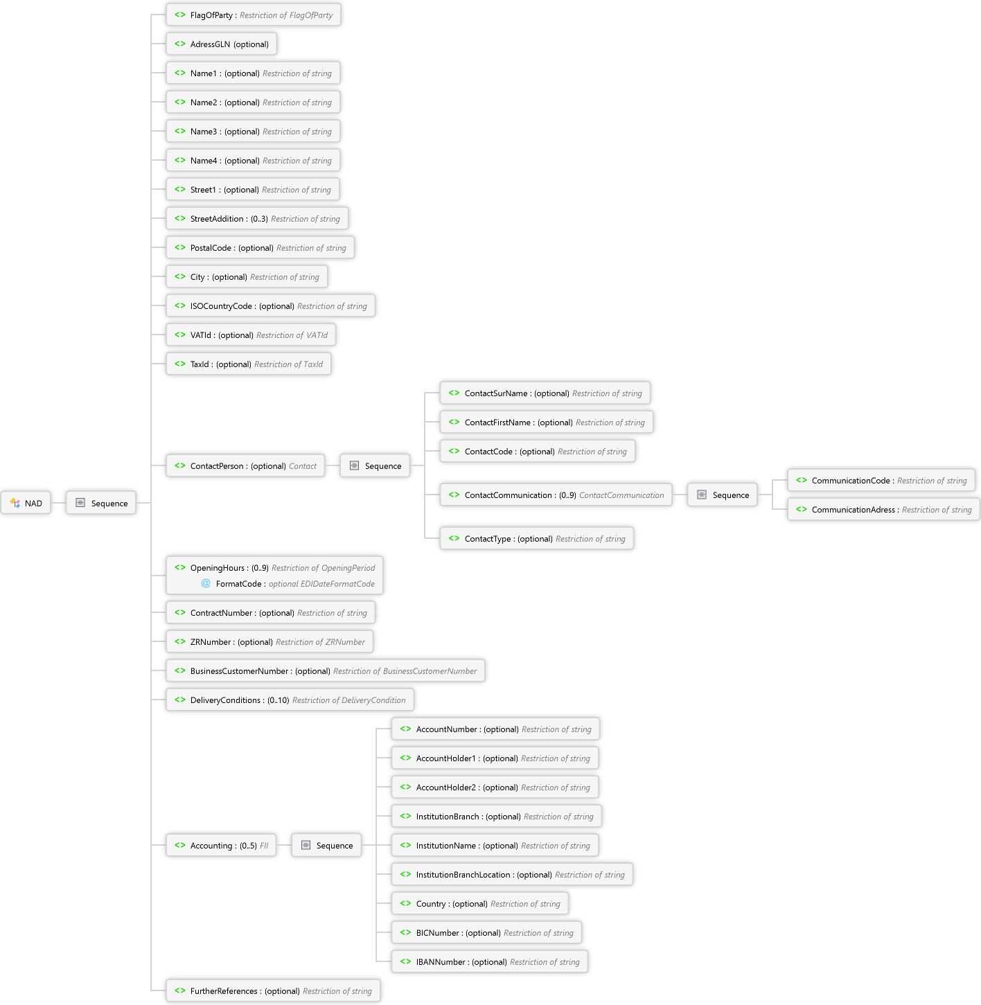 <xs:complexTypename="NAD"xmlns:xs="http://www.w3.org/2001/XMLSchema"><xs:annotation><xs:documentationxml:lang="de">Segment für Adressinformationen </xs:documentation><xs:documentationxml:lang="en">Segment for address information </xs:documentation></xs:annotation><xs:sequence><xs:elementname="FlagOfParty"type="FlagOfParty"minOccurs="1"><xs:annotation><xs:documentationxml:lang="de">Kennung der Adresse </xs:documentation><xs:documentationxml:lang="en">Code for the adresstype </xs:documentation></xs:annotation></xs:element><xs:elementname="AdressGLN"minOccurs="0"><xs:annotation><xs:documentationxml:lang="de">GLN Nummer der Adresse </xs:documentation><xs:documentationxml:lang="en">GLN Code of the address </xs:documentation></xs:annotation></xs:element><xs:elementname="Name1"minOccurs="0"maxOccurs="1"><xs:annotation><xs:documentationxml:lang="de"><dl><dt>Bei Firmen: Firmierung</dt><dt>Bei Privatpersonen: Vorname Nachname</dt></dl></xs:documentation><xs:documentationxml:lang="en"><dl><dt>in case of Companies: Companyname</dt><dt>in case of Endusers: Firstname surname</dt></dl></xs:documentation></xs:annotation><xs:simpleType><xs:restrictionbase="xs:string"><xs:maxLengthvalue="35"/></xs:restriction></xs:simpleType></xs:element><xs:elementname="Name2"minOccurs="0"maxOccurs="1"><xs:annotation><xs:documentationxml:lang="de"><dl><dt>Bei Firmen: Fortsetzung der Firmierung</dt><dt>Bei Privatpersonen: leer</dt></dl></xs:documentation><xs:documentationxml:lang="en"><dl><dt>in case of Companies: Continuation of the Companyname</dt><dt>in case of Endusers: empty</dt></dl></xs:documentation></xs:annotation><xs:simpleType><xs:restrictionbase="xs:string"><xs:maxLengthvalue="35"/></xs:restriction></xs:simpleType></xs:element><xs:elementname="Name3"minOccurs="0"maxOccurs="1"><xs:annotation><xs:documentationxml:lang="de"><dl><dt>Bei Firmen: Leer</dt><dt>Bei Privatpersonen: Vorname</dt></dl></xs:documentation><xs:documentationxml:lang="en"><dl><dt>in case of Companies: Empty</dt><dt>in case of Endusers: First name</dt></dl></xs:documentation></xs:annotation><xs:simpleType><xs:restrictionbase="xs:string"><xs:maxLengthvalue="35"/></xs:restriction></xs:simpleType></xs:element><xs:elementname="Name4"minOccurs="0"maxOccurs="1"><xs:annotation><xs:documentationxml:lang="de"><dl><dt>Bei Firmen: Leer</dt><dt>Bei Privatpersonen: Nachname</dt></dl></xs:documentation><xs:documentationxml:lang="en"><dl><dt>in case of Companies: Empty</dt><dt>in case of Endusers: Surname</dt></dl></xs:documentation></xs:annotation><xs:simpleType><xs:restrictionbase="xs:string"><xs:maxLengthvalue="35"/></xs:restriction></xs:simpleType></xs:element><xs:elementname="Street1"minOccurs="0"><xs:annotation><xs:documentationxml:lang="de">Strasse</xs:documentation><xs:documentationxml:lang="en">Street </xs:documentation></xs:annotation><xs:simpleType><xs:restrictionbase="xs:string"><xs:maxLengthvalue="35"/></xs:restriction></xs:simpleType></xs:element><xs:elementname="StreetAddition"minOccurs="0"maxOccurs="3"><xs:annotation><xs:documentationxml:lang="de">Zusatzinformationen zur Strasse</xs:documentation><xs:documentationxml:lang="en">Additional information to the Street </xs:documentation></xs:annotation><xs:simpleType><xs:restrictionbase="xs:string"><xs:maxLengthvalue="35"/></xs:restriction></xs:simpleType></xs:element><xs:elementname="PostalCode"minOccurs="0"><xs:annotation><xs:documentationxml:lang="de">Postleiztahl</xs:documentation><xs:documentationxml:lang="en">Zip Code </xs:documentation></xs:annotation><xs:simpleType><xs:restrictionbase="xs:string"><xs:maxLengthvalue="17"/></xs:restriction></xs:simpleType></xs:element><xs:elementname="City"minOccurs="0"><xs:annotation><xs:documentationxml:lang="de">Ort</xs:documentation><xs:documentationxml:lang="en">City </xs:documentation></xs:annotation><xs:simpleType><xs:restrictionbase="xs:string"><xs:maxLengthvalue="35"/></xs:restriction></xs:simpleType></xs:element><xs:elementname="ISOCountryCode"minOccurs="0"><xs:annotation><xs:documentationxml:lang="de">ISO Länderkennzeichen</xs:documentation><xs:documentationxml:lang="en">ISO Country Code </xs:documentation></xs:annotation><xs:simpleType><xs:restrictionbase="xs:string"><xs:lengthvalue="2"/><xs:patternvalue="[A-Z]{2}"/></xs:restriction></xs:simpleType></xs:element><xs:elementname="VATId"type="VATId"minOccurs="0"/><xs:elementname="TaxId"type="TaxId"minOccurs="0"/><xs:elementname="ContactPerson"type="Contact"minOccurs="0"maxOccurs="1"/><xs:elementname="OpeningHours"type="OpeningPeriod"minOccurs="0"maxOccurs="9"/><xs:elementname="ContractNumber"minOccurs="0"><xs:annotation><xs:documentationxml:lang="de">Abkommensnummer </xs:documentation><xs:documentationxml:lang="en">Contract number </xs:documentation></xs:annotation><xs:simpleType><xs:restrictionbase="xs:string"><xs:maxLengthvalue="35"/></xs:restriction></xs:simpleType></xs:element><xs:elementname="ZRNumber"type="ZRNumber"minOccurs="0"/><xs:elementname="BusinessCustomerNumber"type="BusinessCustomerNumber"minOccurs="0"/><xs:elementname="DeliveryConditions"type="DeliveryCondition"minOccurs="0"maxOccurs="10"/><xs:elementname="Accounting"type="FII"minOccurs="0"maxOccurs="5"/><xs:elementname="FurtherReferences"minOccurs="0"><xs:annotation><xs:documentationxml:lang="de">z.B. Depotnummer/Abladestelle </xs:documentation><xs:documentationxml:lang="en">e.g. depot number </xs:documentation></xs:annotation><xs:simpleType><xs:restrictionbase="xs:string"><xs:maxLengthvalue="35"/></xs:restriction></xs:simpleType></xs:element></xs:sequence></xs:complexType>