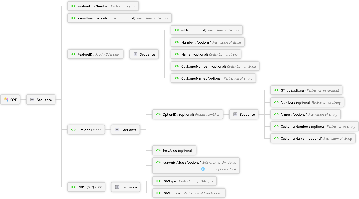 DPPAddress Element DPPType Element Sequence DPP Element NumericValue Element TextValue Element CustomerName Element CustomerNumber Element Name Element Number Element GTIN Element Sequence OptionID Element Sequence Option Element CustomerName Element CustomerNumber Element Name Element Number Element GTIN Element Sequence FeatureID Element ParentFeatureLineNumber Element FeatureLineNumber Element Sequence OPT Complex Type
