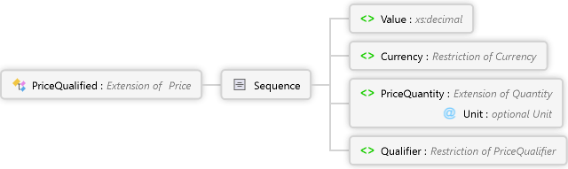 <xs:complexTypename="PriceQualified"xmlns:xs="http://www.w3.org/2001/XMLSchema"><xs:annotation><xs:documentationxml:lang="de">Preisangabe mit definierten Preistyp über einen Qualifer</xs:documentation><xs:documentationxml:lang="en">Price information with a defined price type by a qualifier</xs:documentation></xs:annotation><xs:complexContent><xs:extensionbase="Price"><xs:sequence><xs:elementname="Qualifier"type="PriceQualifier"minOccurs="1"maxOccurs="1"/></xs:sequence></xs:extension></xs:complexContent></xs:complexType>