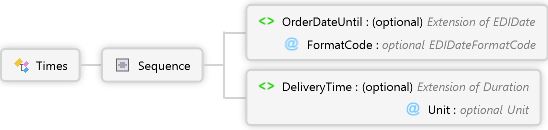 <xs:complexTypename="Times"xmlns:xs="http://www.w3.org/2001/XMLSchema"><xs:annotation><xs:documentationxml:lang="de">Zeitenangaben in den Lieferzeiten</xs:documentation><xs:documentationxml:lang="en">Times within the delivery times section</xs:documentation></xs:annotation><xs:sequence><xs:elementname="OrderDateUntil"type="EDIDate"minOccurs="0"maxOccurs="1"><xs:annotation><xs:documentationxml:lang="de"> Bei Bestellung bis zu diesem Datum gilt nachfolgende Lieferzeit.</xs:documentation><xs:documentationxml:lang="en"> For oders unti this date the subsequent delivery time is valid.</xs:documentation></xs:annotation></xs:element><xs:elementname="DeliveryTime"type="Duration"minOccurs="0"maxOccurs="1"/></xs:sequence></xs:complexType>