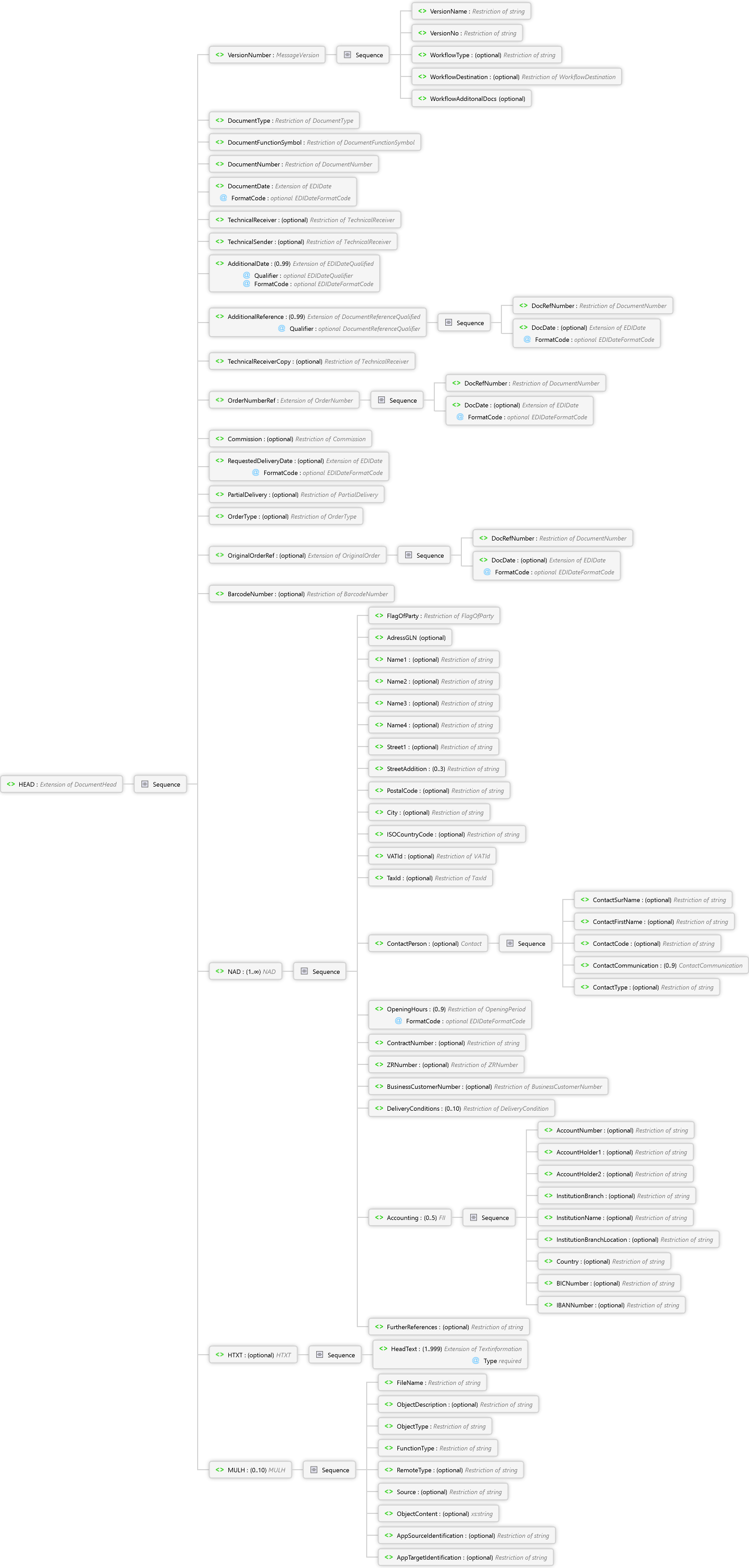 <xs:elementname="HEAD"minOccurs="1"maxOccurs="1"xmlns:xs="http://www.w3.org/2001/XMLSchema"><xs:annotation><xs:documentationxml:lang="de">Kopfteil der Bestelländerung (ORCHG) </xs:documentation><xs:documentationxml:lang="en">Head of the order change (ORDCGF) </xs:documentation></xs:annotation><xs:complexType><xs:complexContent><xs:extensionbase="DocumentHead"><xs:sequence><xs:elementname="OrderNumberRef"type="OrderNumber"minOccurs="1"/><xs:elementname="Commission"type="Commission"minOccurs="0"/><xs:elementname="RequestedDeliveryDate"type="EDIDate"minOccurs="0"/><xs:elementname="PartialDelivery"type="PartialDelivery"minOccurs="0"/><xs:elementname="OrderType"type="OrderType"minOccurs="0"/><xs:elementname="OriginalOrderRef"type="OriginalOrder"minOccurs="0"/><xs:elementname="BarcodeNumber"type="BarcodeNumber"minOccurs="0"/><xs:elementname="NAD"type="NAD"minOccurs="1"maxOccurs="unbounded"/><xs:elementname="HTXT"type="HTXT"minOccurs="0"maxOccurs="1"/><xs:elementname="MULH"type="MULH"minOccurs="0"maxOccurs="10"/></xs:sequence></xs:extension></xs:complexContent></xs:complexType></xs:element>