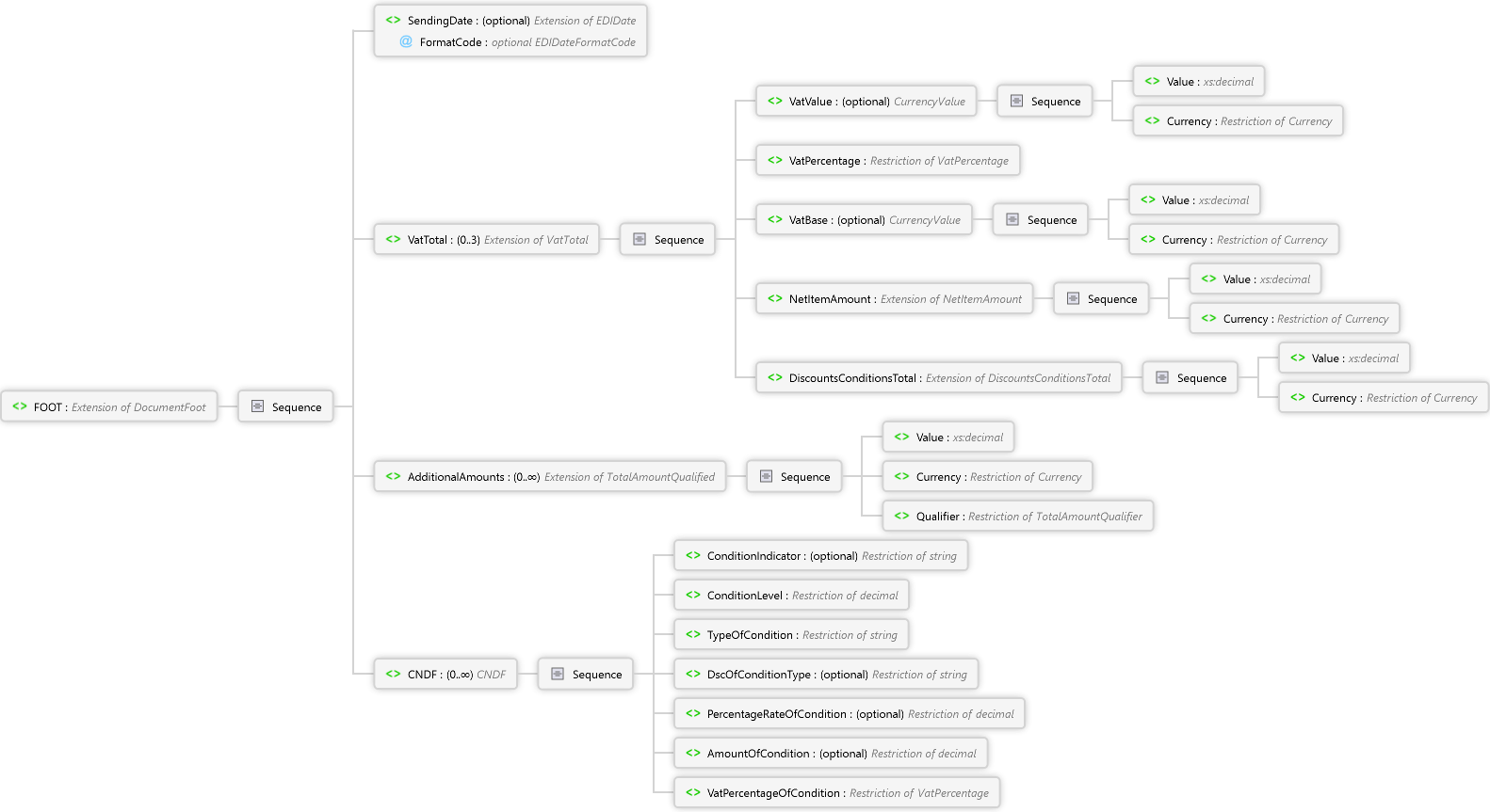 VatPercentageOfCondition Element AmountOfCondition Element PercentageRateOfCondition Element DscOfConditionType Element TypeOfCondition Element ConditionLevel Element ConditionIndicator Element Sequence CNDF Element Qualifier Element Currency Element Value Element Sequence AdditionalAmounts Element Currency Element Value Element Sequence DiscountsConditionsTotal Element Currency Element Value Element Sequence NetItemAmount Element Currency Element Value Element Sequence VatBase Element VatPercentage Element Currency Element Value Element Sequence VatValue Element Sequence VatTotal Element SendingDate Element Sequence FOOT Element