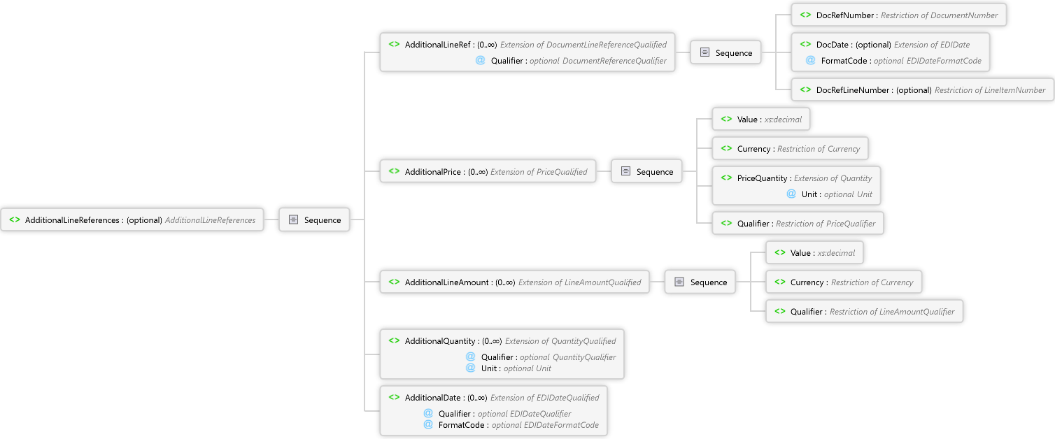 AdditionalDate Element AdditionalQuantity Element Qualifier Element Currency Element Value Element Sequence AdditionalLineAmount Element Qualifier Element PriceQuantity Element Currency Element Value Element Sequence AdditionalPrice Element DocRefLineNumber Element DocDate Element DocRefNumber Element Sequence AdditionalLineRef Element Sequence AdditionalLineReferences Element