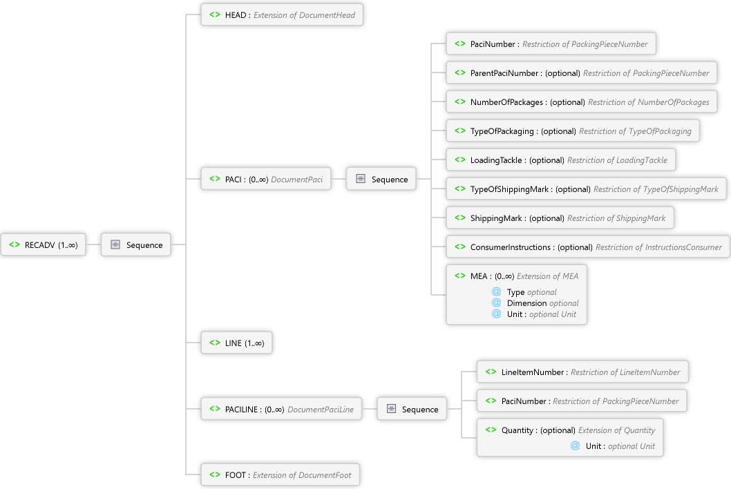 FOOT Element Quantity Element PaciNumber Element LineItemNumber Element Sequence PACILINE Element LINE Element MEA Element ConsumerInstructions Element ShippingMark Element TypeOfShippingMark Element LoadingTackle Element TypeOfPackaging Element NumberOfPackages Element ParentPaciNumber Element PaciNumber Element Sequence PACI Element HEAD Element Sequence RECADV Element