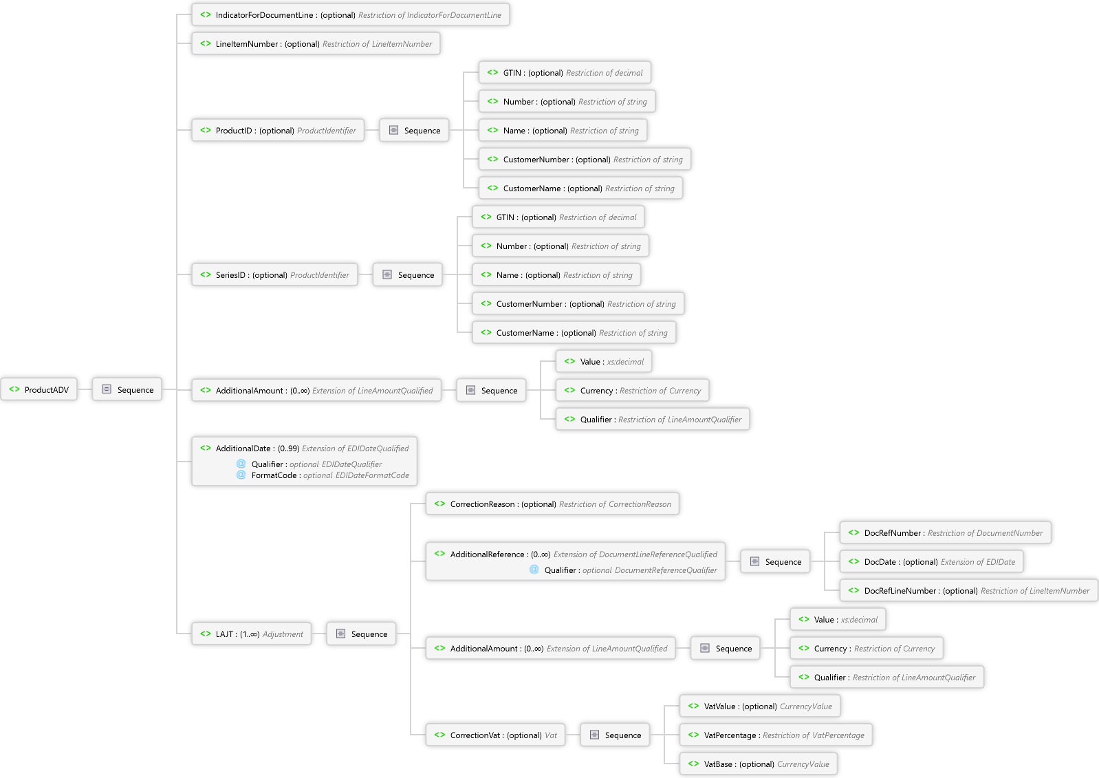 <xs:element name="ProductADV" xmlns:xs="http://www.w3.org/2001/XMLSchema"> <xs:complexType> <xs:sequence> <xs:element name="IndicatorForDocumentLine" type="IndicatorForDocumentLine" minOccurs="0" /> <xs:element name="LineItemNumber" type="LineItemNumber" minOccurs="0" /> <xs:element name="ProductID" type="ProductIdentifier" minOccurs="0" /> <xs:element name="SeriesID" type="ProductIdentifier" minOccurs="0" /> <xs:element name="AdditionalAmount" type="LineAmountQualified" minOccurs="0" maxOccurs="unbounded" /> <xs:element name="AdditionalDate" type="EDIDateQualified" minOccurs="0" maxOccurs="99" /> <xs:element name="LAJT" type="Adjustment" minOccurs="1" maxOccurs="unbounded" /> </xs:sequence> </xs:complexType> </xs:element>